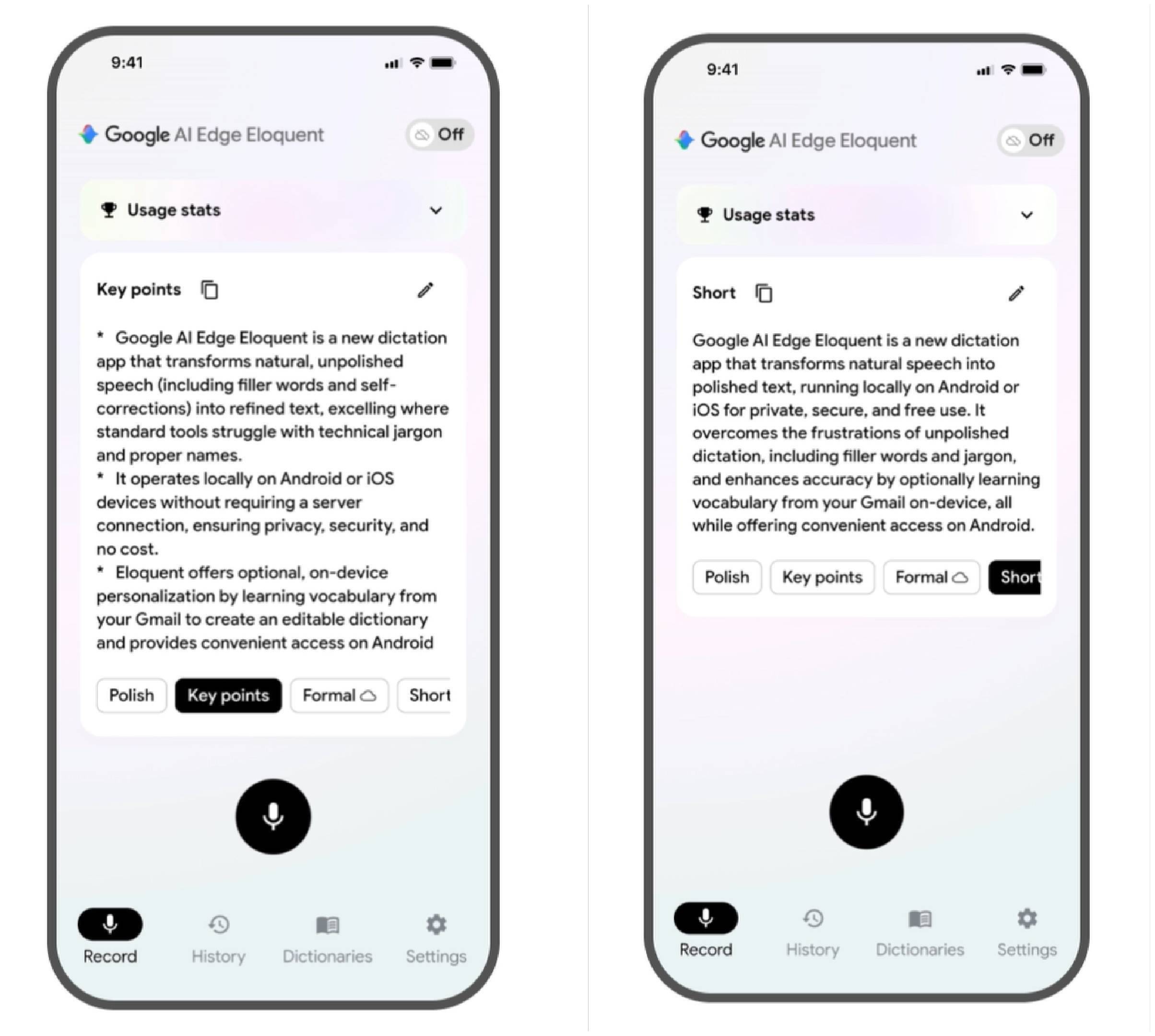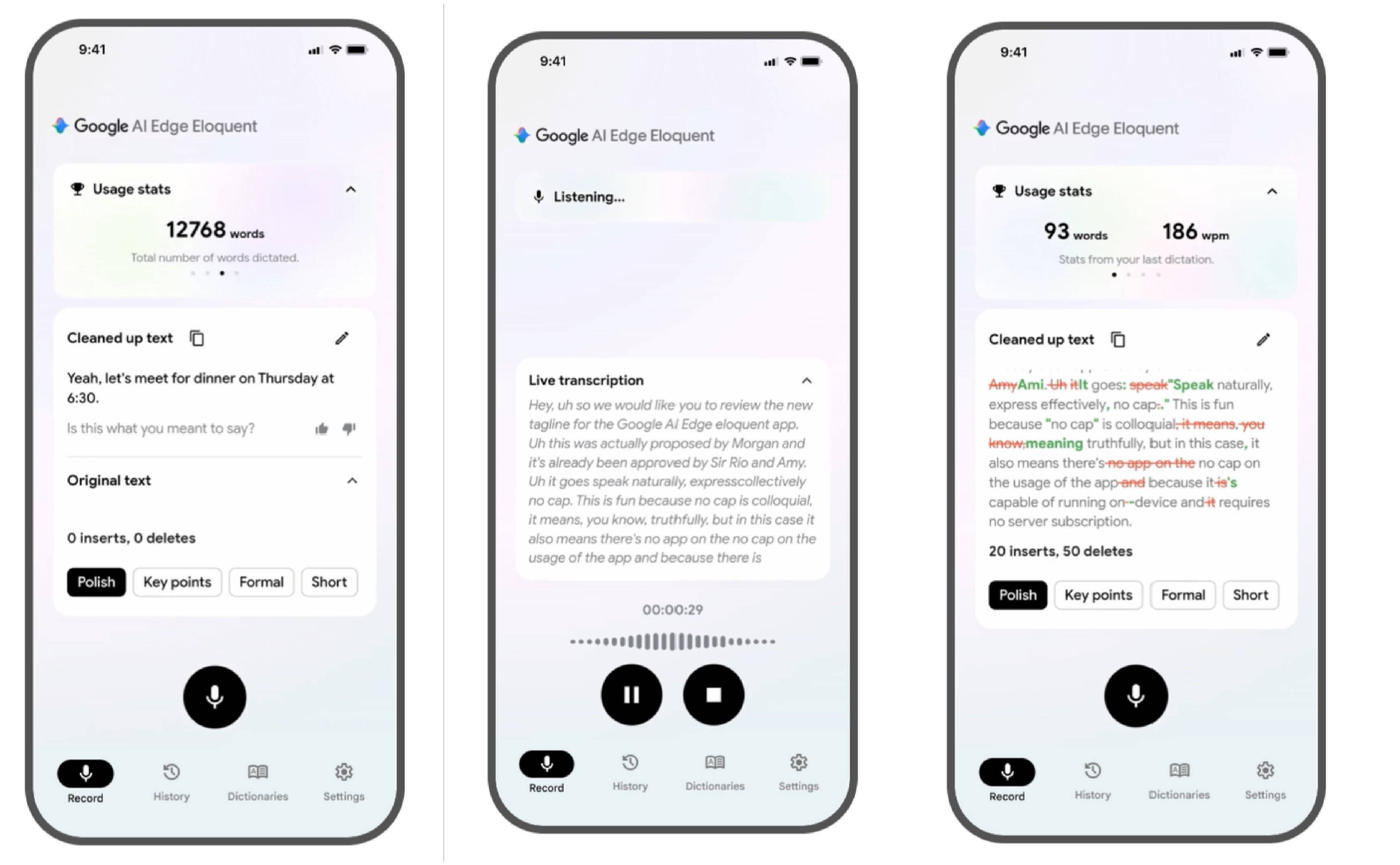 在云端模式下,语音识别仍在设备端启动,但文本润色由云端的Gemini模型完成。这种可切换机制,使用户在隐私与效果之间拥有选择空间,尤其适用于对数据流转敏感的使用场景。